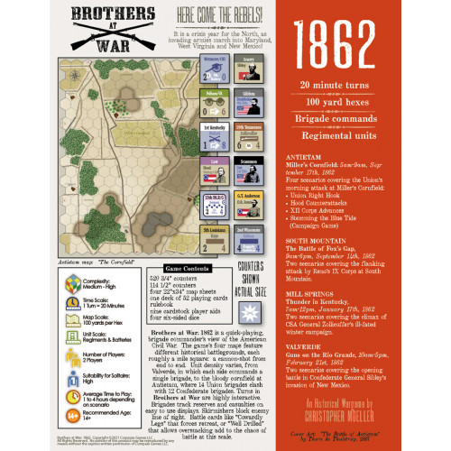 Brothers at War: 1862 es un juego de guerra táctico de juego rápido que explora el mando de la brigada de la guerra civil. Este es un conjunto de cuatro juegos, cada uno con un mapa de juego de tamaño completo de 22 × 34 ″ y que cubre batallas de 1862: Antietam, South Mountain, Mill Springs y Bloody Valverde.