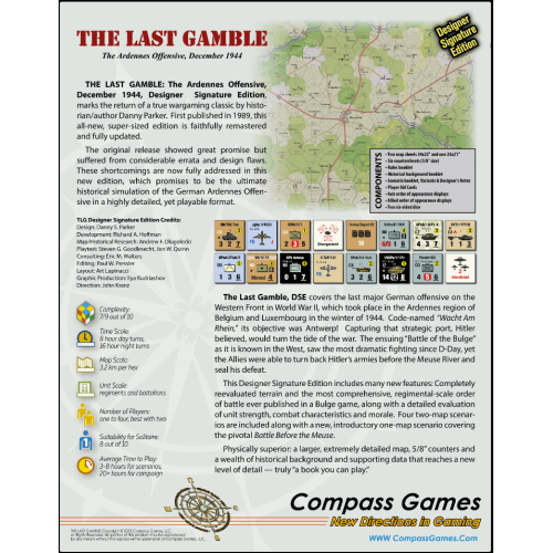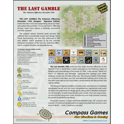 The Last Gamble: The Battle of the Bulge, publicado por primera vez en 1989, ha sido fielmente remasterizado y actualizado con esta nueva edición de gran tamaño. El diseñador, ganador del premio CSR, es reconocido como autor y experto en la Batalla de las Ardenas, habiendo diseñado nada menos que seis juegos sobre el tema. El lanzamiento original era muy prometedor con un excelente orden de batalla, pero contenía considerables erratas que limitaban la diversión del juego. Estas deficiencias ahora se abordan por completo en esta nueva y mejorada edición que promete aprovechar todo el potencial de esta simulación de nivel operativo para dos a cinco jugadores que cubre la Batalla de las Ardenas en un formato muy detallado pero inminentemente jugable.