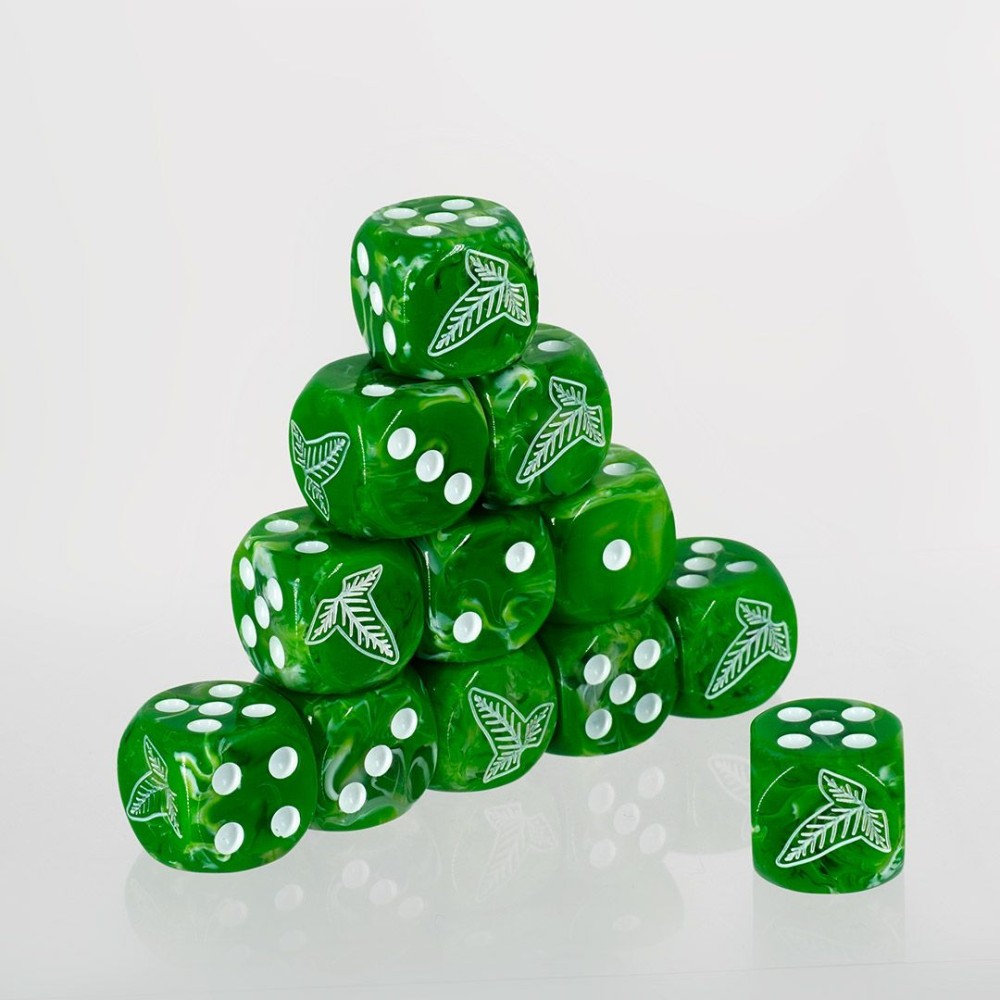 Set de 12 dados acrílicos verde y blanco con números en blanco y logo para jugar Lothlórien