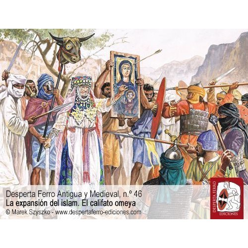 Tradicionalmente, las tribus del desierto arábigo se entregaban a incursiones y golpes de mano con objeto de obtener botín y cobrarse venganza. La fe islámica federó a estas tribus y les dio una causa común, haciendo de ellos una formidable máquina militar que en pocos años dominó una extensísima franja de territorio. A la muerte del Profeta (632), el liderazgo pasó a manos de una sucesión de califas que mantuvieron unida a la comunidad islámica (umma) y contribuyeron al esfuerzo expansivo. Sin embargo, el sistema sucesorio no estaba aún bien definido y, consecuentemente, producía terribles enfrentamientos entre los candidatos. No todos los califas gozaban del apoyo unánime de la comunidad. Así, las discordias se manifestaron con brutalidad, sobre todo tras el asesinato del califa Utmán (656) y su sucesión en la persona de Alí, yerno del Profeta, que dio lugar a la primera guerra civil musulmana o fítna, que se zanjó con dos grandes consecuencias: la elevación del califato omeya de la mano de Muawiya I, y la consolidación de la división del islam en tres ramas: suníes, chiíes y jariyíes (estos últimos minoritarios hoy en día), que acompañará a la historia de esta fe hasta nuestros días. El nuevo califa instauró una dinastía hereditaria y dotó al islam de un Estado complejo, sofisticado y sólido. No en vano supuso el periodo de mayor y más rápida expansión territorial del islam, tanto en oriente, como por occidente.