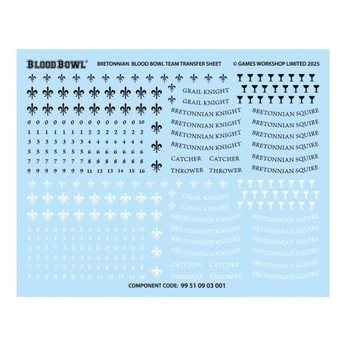 El kit se proporciona con una hoja con 320 calcomanías de gran calidad para equipos Bretonnian de Blood Bowl, con flores de lis y griales, marcadores de función y números para decorar tus miniaturas.