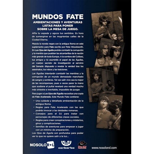 Mezcla la novela negra con la antigua Roma en este suplemento para Fate escrito por Pete Woodworth. En Los Ojos del Águila podrás combatir la corrupción y la mentira que pueblan las alcantarillas de la nación más grande de toda Europa. A la sombra del Coliseo, tus amigos y tú asumiréis el papel de las Águilas, un cuerpo secreto de investigación al servicio del Senado dispuesto a revelar la verdad tras los asesinatos, los robos y las traiciones.