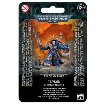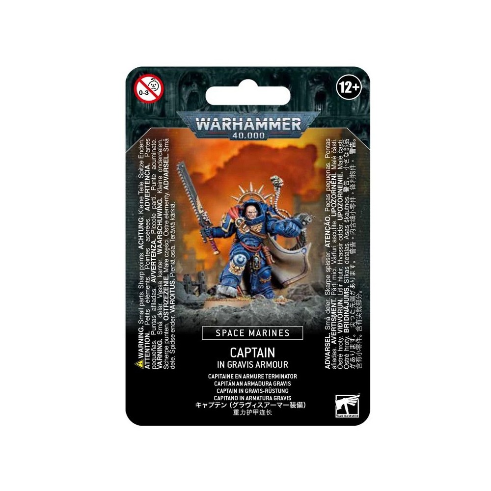 Este kit consta de 25 piezas de plástico, con las que puedes montar 1 Capitán Marine Espacial en armadura Gravis, equipado con una espada sierra de energía, una espada de energía o un puño de energía, y un guantelete boltormenta. Se suministra con una peana redonda Citadel de 40 mm.