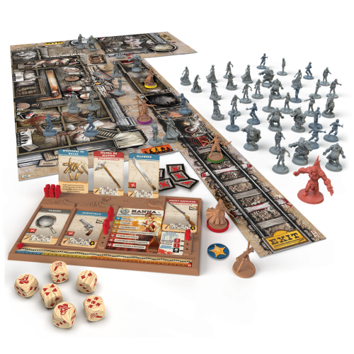 88 miniaturas: 14 Supervivientes , 40 Caminantes, 16 Brutos, 16 Corredores, 1 Abominación, 1 Ametralladora Gatling; 6 peanas de colores , 6 paneles de control, 14 tarjetas de Superviviente, 120 cartas pequeñas: 82 cartas de Equipo, 37 cartas de Zombi, 1 carta de Abominación; 12 módulos de tablero de doble cara, 6 dados, 48 indicadores, 29 fichas, 1 cuaderno de reglas