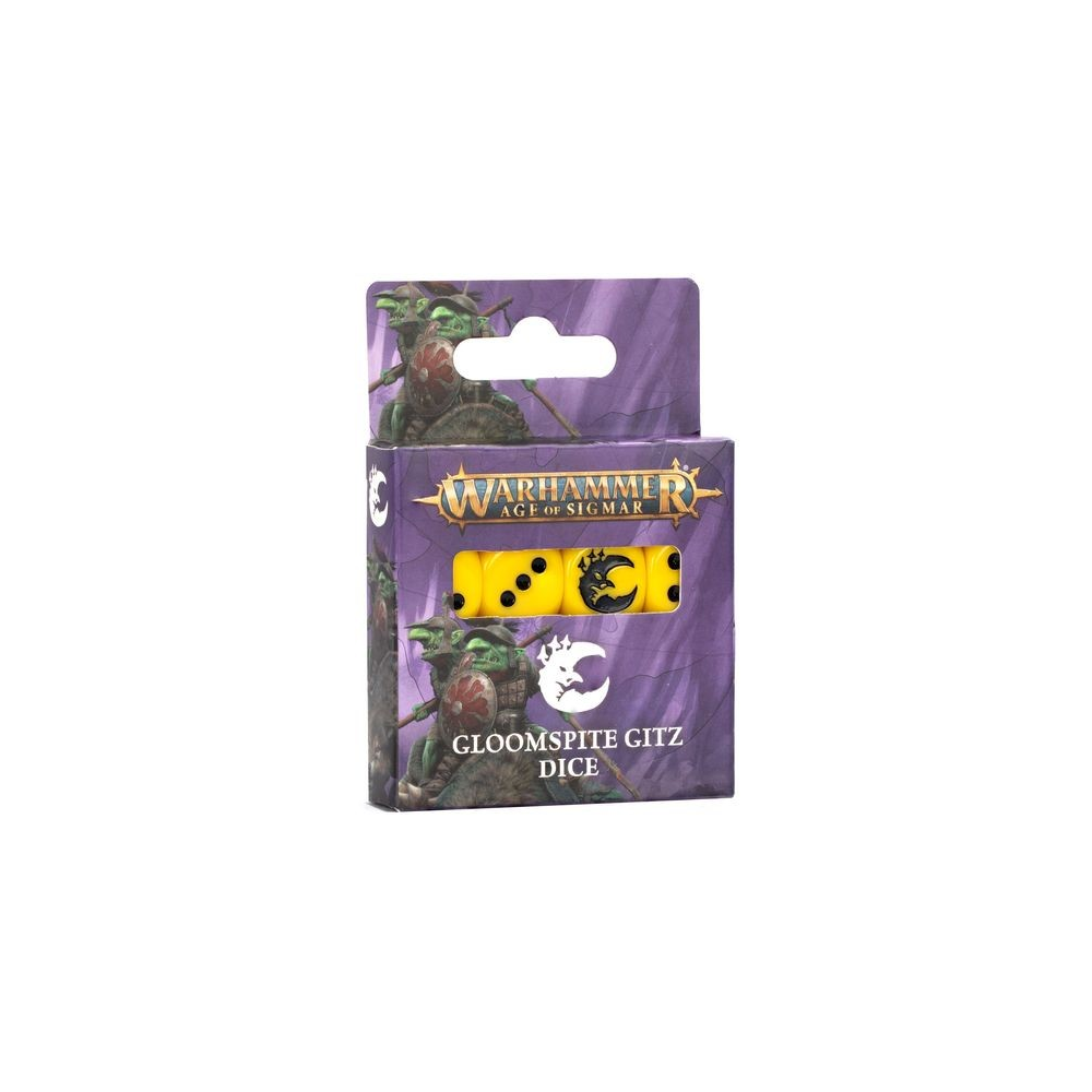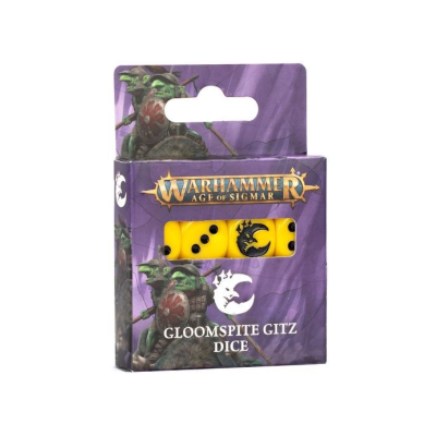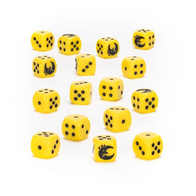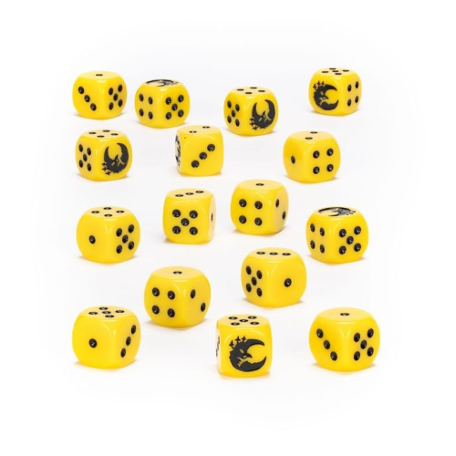 Este juego de 16 dados de seis caras con bordes redondeados para usar en partidas de Warhammer Age of Sigmar presenta la temática de los Tipejoz Nokturnoz. Están fabricados en plástico acrílico amarillo con muescas y diseños en tinta negra, y miden 16 mm de arista. Las caras del 1 al 5 presentan los puntos tradicionales y la cara del 6 está decorada con el icono de los Tipejoz Nokturnoz, la Luna Malvada cubierta de setas.