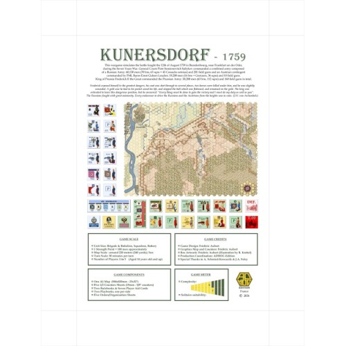 REF: ADHKUNGBKunersdorf 1759, el tercer juego de la serie "SYWBS", simula la batalla librada el 12 de agosto de 1759 en Brandebourg, cerca de Frankfurt an der Oder, durante la Guerra de los Siete Años. El general conde Piotr Semionovitch Saltykov comandaba un ejército combinado compuesto por un ejército ruso: 60.150 hombres (70 bns, 63 sqns + 45 sotnias cosacos) y 201 cañones de campaña y un contingente austriaco comandado por el barón del FML Ernst Gideon Loudon: 19.200 hombres (16 bns + Grenzers, 36 escuadrones) y 10 cañones de campaña. El rey de Prusia Federico II el Grande comandaba el ejército prusiano: 50.200 hombres (63 mil hombres, 112 escuadrones) y 160 cañones de campaña en total.
