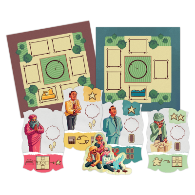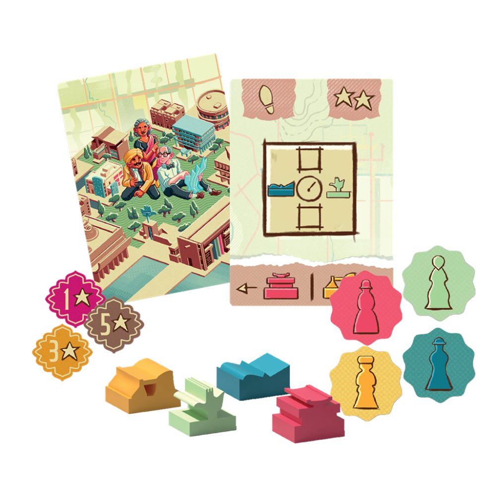 12 losetas de especialista a doble cara, 16 losetas de sector a doble cara, 36 cartas de proyecto, 72 edificios, 4 arquitectos, 4 peones de especialista, 20 supervisores, 16 fichas de especialistas, 78 puntos de prestigio, 10 losetas de calle, 1 ficha de jugador inicial