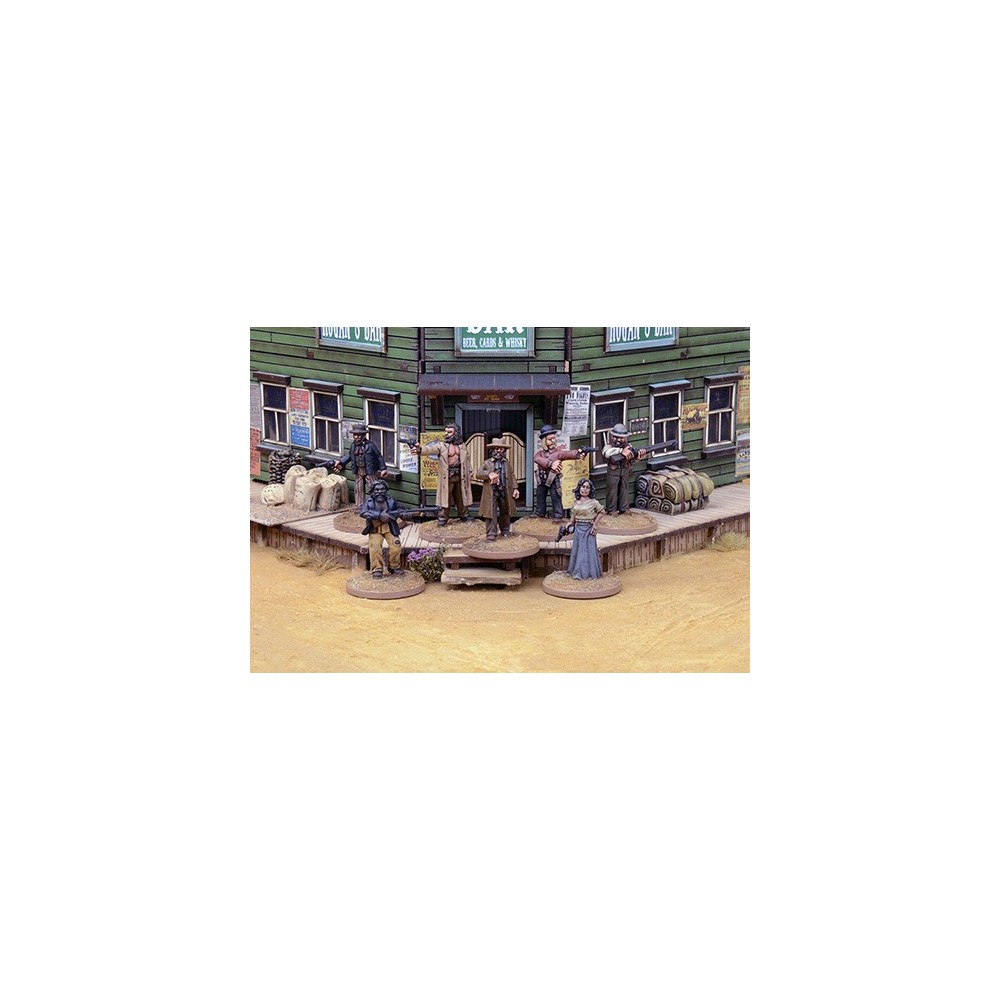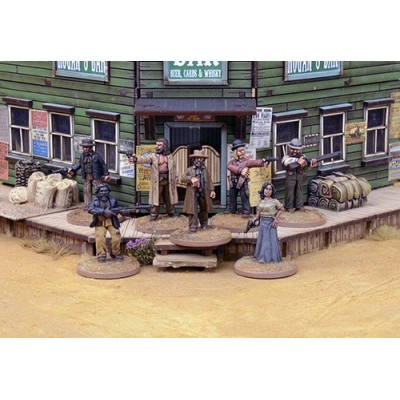 Banda de Bushrangers en caja que incluye una tarjeta de reglas especiales y bases. Los modelos se suministran sin pintar.