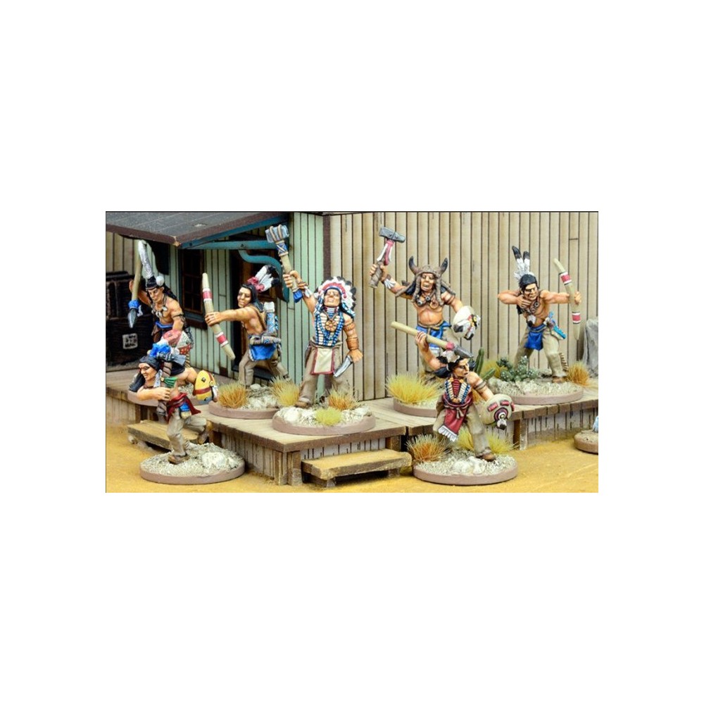 Banda de indios de las llanuras en caja que incluye hojas de reglas especiales y peanas. Siete miniaturas de metal de 28 mm, se suministran sin pintar.