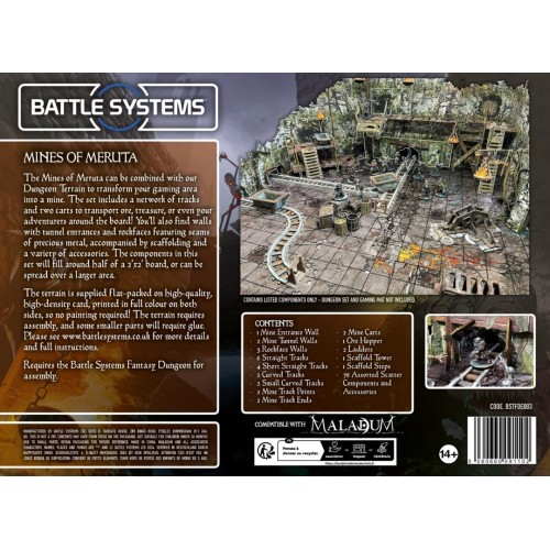 REF: BSTFDE003Este set de Minas de Meruta se puede combinar con nuestro terreno de mazmorras para transformar tu zona de juego en una mina. El set incluye una red de vías y dos vagonetas para transportar mineral, tesoros o incluso a tus aventureros por el tablero.