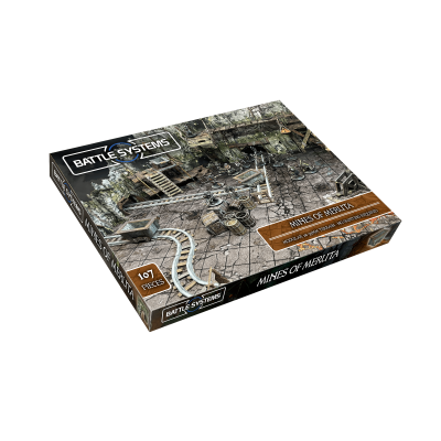 Las Minas de Meruta se pueden combinar con el Terreno de Mazmorra para transformar tu área de juego en una mina. Los túneles pueden extenderse hacia el horizonte por los bordes del tablero, mientras que el área de juego representa la entrada de la mina, donde se unen las vías y donde tiene lugar la acción. Hay suficientes vías para recorrer varias salas si lo deseas, o se puede configurar como una gran área abierta, tal y como se ve en nuestras fotos. Este contenido está diseñado para colocarse en un borde de tu área de juego y hay suficiente para llenar aproximadamente la mitad de un tablero estándar de 2x2.
