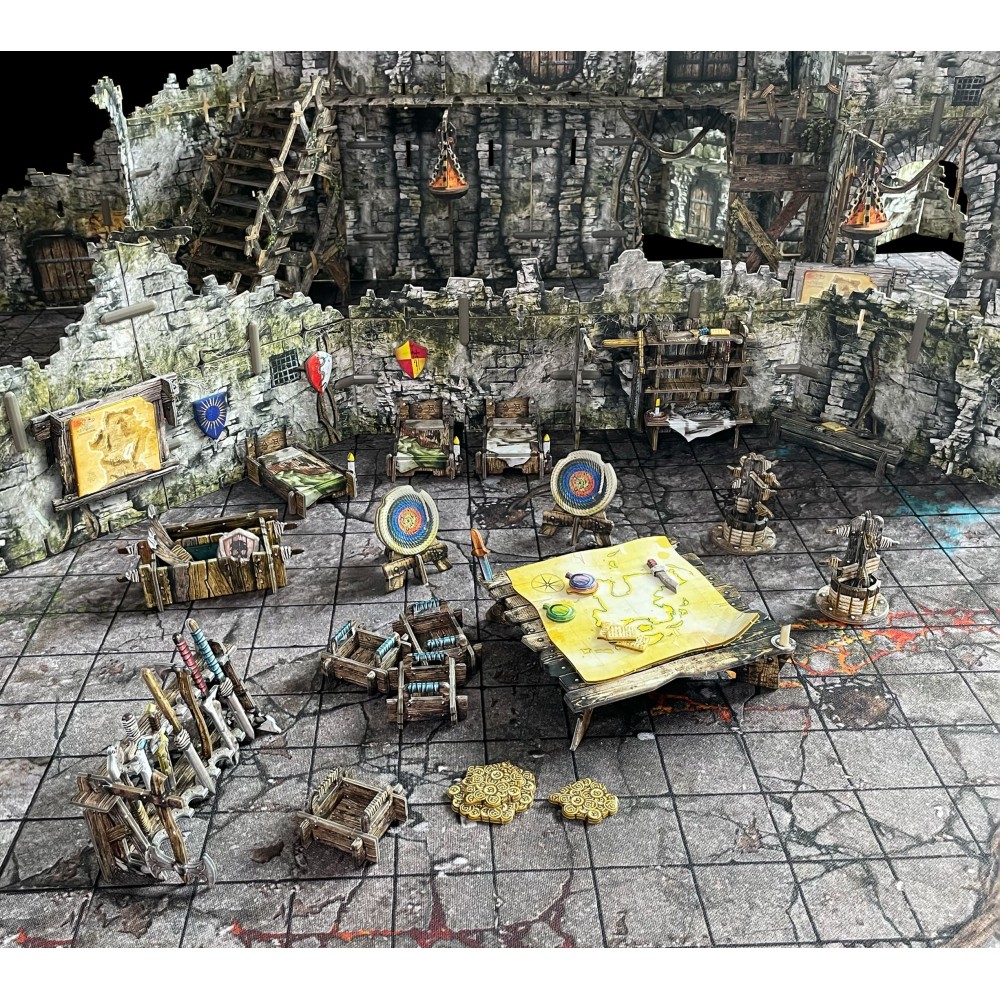 Este pack amueblará completamente un cuartel, perfecto para que tus tropas descansen, entrenen y elaboren estrategias entre batallas. Incluye una armería, una sala de guerra, un almacén de guerra, una sala de entrenamiento y dormitorios. Funciona en combinación con el resto de la gama Battle Systems Dungeon.