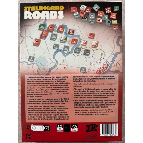 Stalingrad Roads es un juego de guerra para 2 jugadores que cubre la campaña de invierno de 1942-43 en el frente sur soviético. El juego comienza con el estallido de la ofensiva de Urano a finales de noviembre de 1942 y termina con el contraataque de Manstein en marzo de 1943. El juego está alineado con la serie 'Roads', que presenta los títulos Liberty Roads y Victory Roads (publicado por Hexasim). El sistema será familiar para los jugadores que hayan disfrutado de los dos primeros juegos, pero se ha adaptado para tener en cuenta todos los detalles de la campaña.