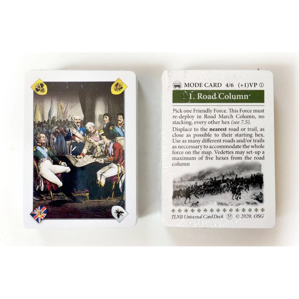 Estos mazos son los únicos que necesitas para jugar los wargames del sistema TLNB. El mazo de cartas universal y el mazo de cartas francés se incluyen en todas las copias de Napoleon's Wheel (210). Napoleon in Spain (211) fue el primer título que se publicó SIN cartas en la caja. Los Mazos Universales reducen costos y salvan árboles. ¡Gracias!