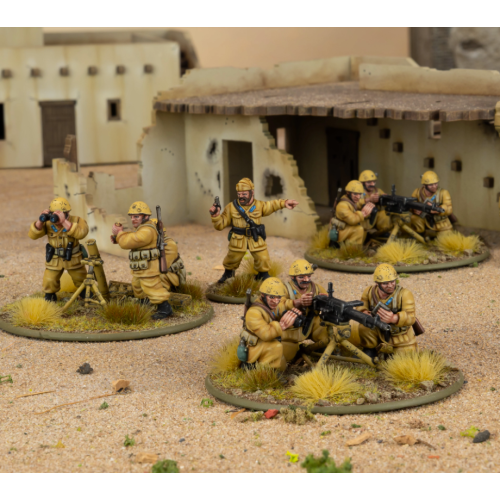 Al ser unas de las mejores tropas disponibles para los comandantes italianos, los Paracadutisti contaban con una gran potencia de fuego de apoyo en forma de ametralladoras y morteros, y los utilizaban con gran eficacia. En este set, incluye un par de ametralladoras Breda M37 montadas sobre trípodes para actuar como equipos de ametralladoras medianas, y un mortero mediano para lanzar explosivos de alta potencia sobre las cabezas de tus enemigos. También se incluye un oficial para comandar los equipos de armas, lo que convierte el contenido de esta caja en un pelotón de armas pesadas listo para el juego en acción de cerrojo.