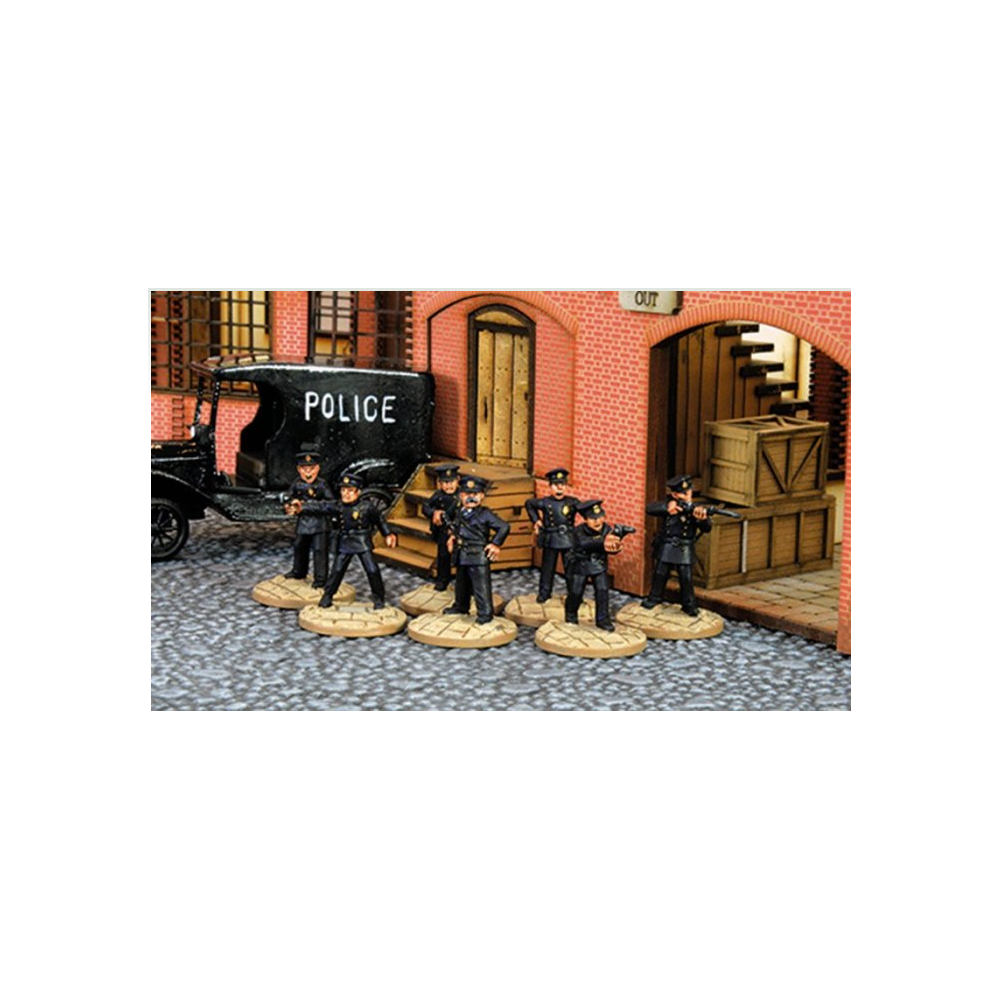Pandilla de 7 policías en caja, incluye tarjeta de reglas especiales y peanas. Las miniaturas son figuras metálicas de 28 mm que se suministran sin pintar. Se pueden entregar sin caja.
