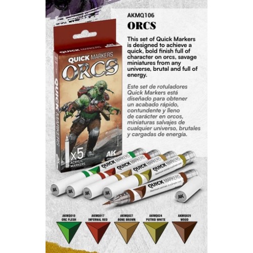 Este set de rotuladores Quick Markers está diseñado para obtener un acabado rápido, contundente y lleno de carácter en orcos, miniaturas salvajes de cualquier universo, brutales y cargadas de energía.