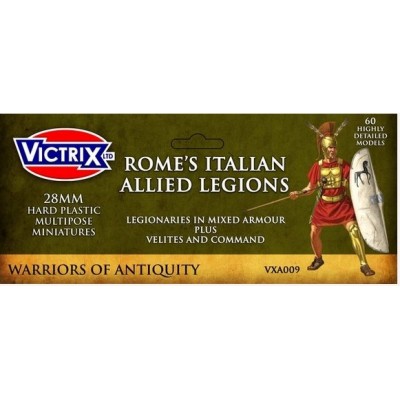 REF: VXA009Esta caja contiene 60 figuras de plastico de 28mm que representan a los legionarios itálicos aliados de la Republica Romana. Particparon en la Primera Guarra Punica, Segunda Guerra Púnica y la guerra contra Pirro, entre otras.