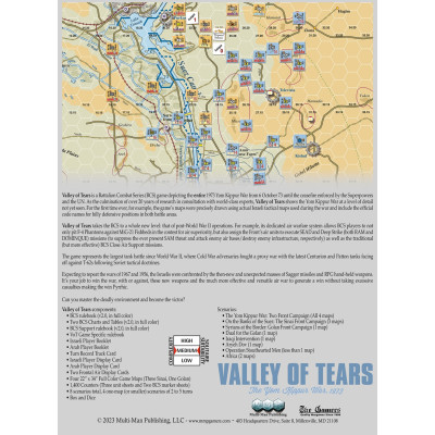 REF: BCS-VOTValley of Tears es un juego de Battalion Combat Series que representa toda la guerra de Yom Kippur de 1973, desde el 6 de octubre de 1973 hasta el alto el fuego impuesto por las superpotencias y la ONU. Como culminación de más de 20 años de investigación en consulta con expertos de talla mundial, Valley of Tears muestra la guerra de Yom Kippur con un nivel de detalle nunca antes visto. Por primera vez, por ejemplo, los mapas del juego se dibujaron con precisión utilizando mapas tácticos israelíes reales utilizados durante la guerra e incluyen los nombres en clave oficiales de las posiciones defensivas montañosas en ambas áreas de batalla.