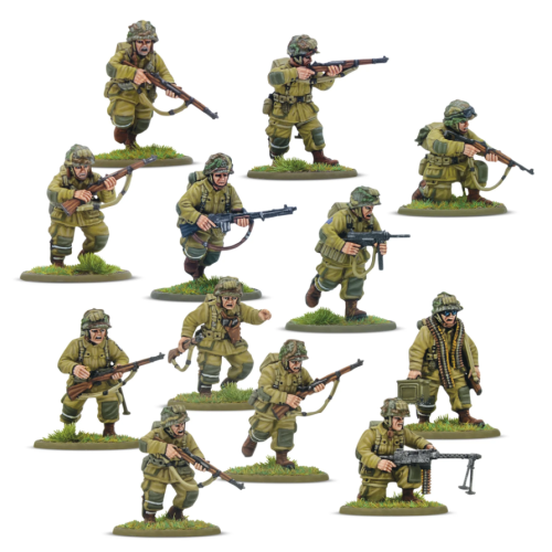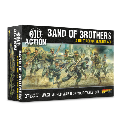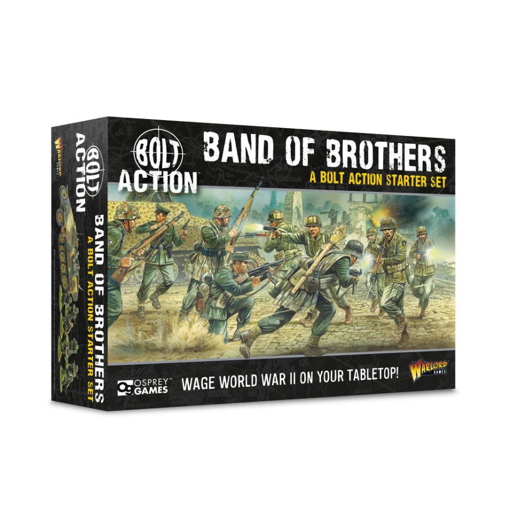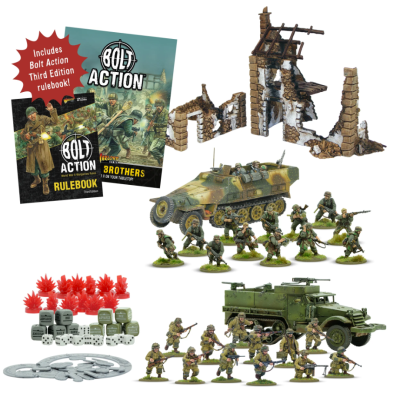 Band of Brothers es la mejor manera de iniciarse en Bolt Action: Tercera Edición, tanto si eres principiante como un veterano de mil batallas. Audaces Aerotransportadas estadounidenses y tenaces Granaderos alemanes, así como dos semiorugas de plástico para apoyarlas en la batalla y un tapete de batalla de doble cara con escenografía de plástico para ambientar tus partidas. ¡Aprende a construir tus nuevas miniaturas y llévalas directamente a la acción! A través de una serie de divertidas misiones introductorias, te familiarizarás con las mecánicas clave de Bolt Action. ¡En un abrir y cerrar de ojos, estarás liderando a tus fuerzas en la batalla!