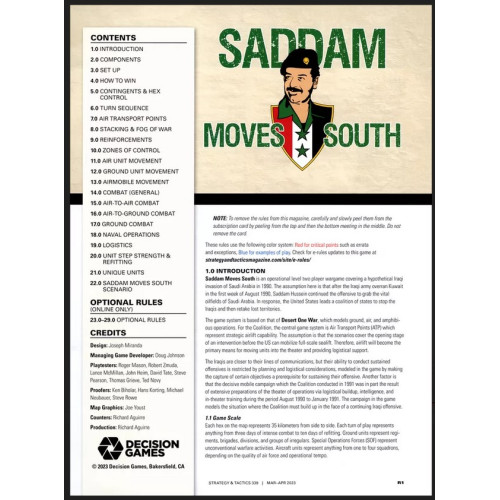Saddam Moves South (SMS), Strategy & Tactics Decision Games, es un wargame de nivel operacional para dos jugadores que cubre una hipotética invasión iraquí de Arabia Saudí en 1990. La suposición aquí es que después de que el ejército iraquí invadiera Kuwait en la primera semana de agosto de 1990, Saddam Hussein continuó la ofensiva para apoderarse de los campos petroleros vitales de Arabia Saudí. En respuesta, Estados Unidos lidera una coalición de estados para detener a los iraquíes y luego recuperar los territorios perdidos. El sistema de juego se basa en el de Desert One War, que modela operaciones terrestres, aéreas y anfibias.