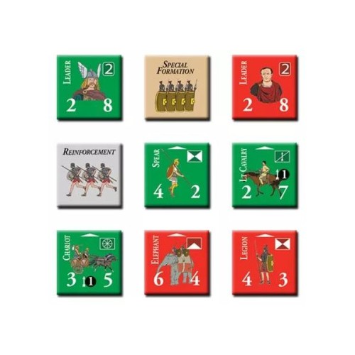 Cada hexágono en el mapa representa 100-200 metros de ancho, dependiendo de la batalla. Cada turno de juego representa de 15 a 45 minutos, dependiendo de la intensidad de la acción. Las unidades representan de tres a cinco cohortes romanas, sus equivalentes o agrupaciones amorfas de irregulares (1.000 a 3.000 hombres, según la época y la eficiencia del ejército). Los líderes representan a grandes comandantes individuales, jefes de guerra o el personal de una legión u otra formación superior. Diseño de Joseph Miranda