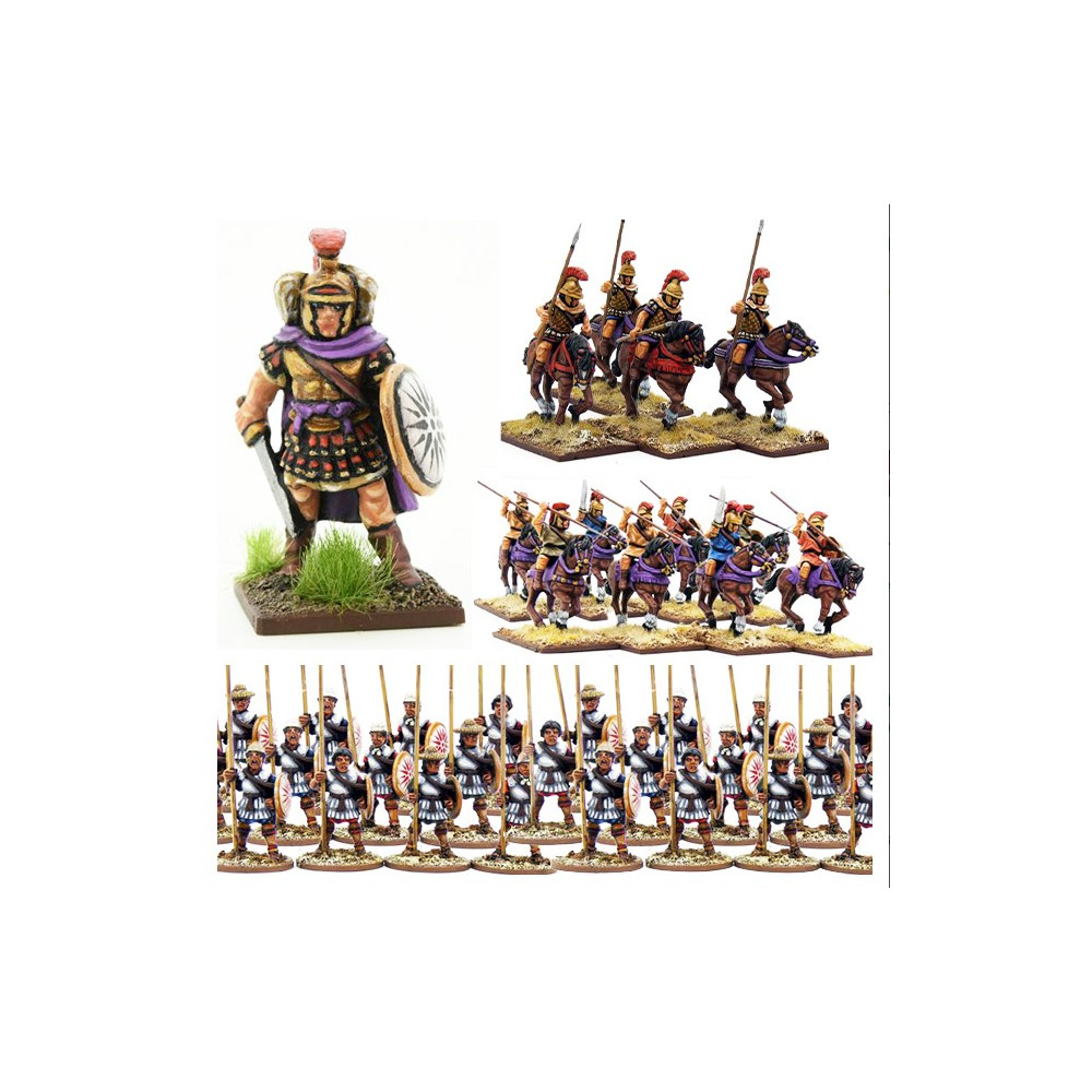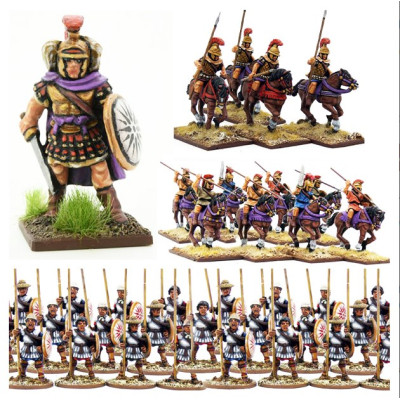 Contiene 12 figuras a caballo y 25 a pie, todas en metal y de escala de 28mm. Se suministran todas las armas, escudos, lanzas y bases