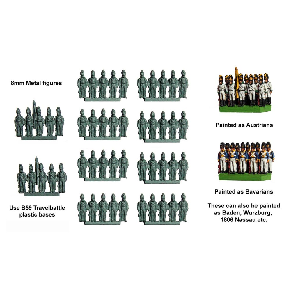50 figuras napoleónicas de metal de 8mm de infantería con casco. Se pueden pintar como infantería austriaca o infantería bávara. El pack incluye dos grupos de mando y ocho grupos de infantería. Guerras Napoleónicas