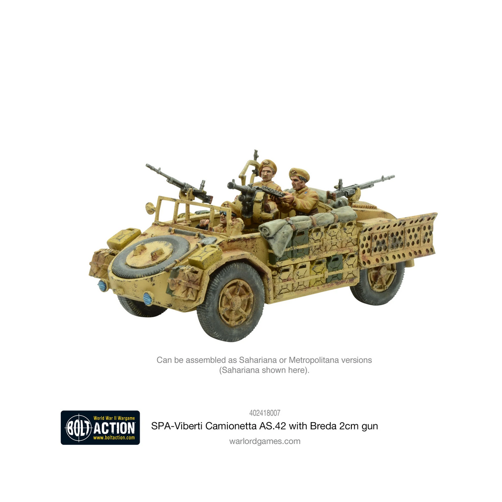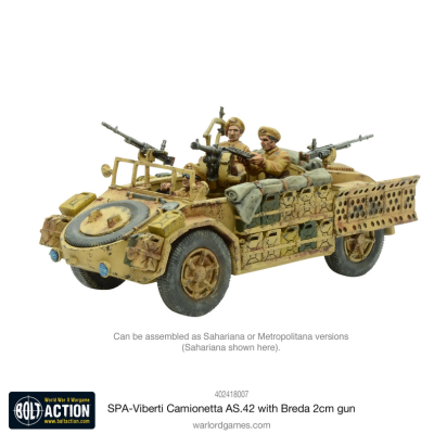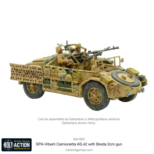 Este vehículo se suministra con piezas para hacer un Sahariana o Metropolitana junto con un cañón automático Breda de 2 cm montado en un pivote, dos ametralladoras medianas y tres figuras de la tripulación Arditi. También se incluyen una tarjeta de estadísticas de Bolt Action y marcadores de daños al vehículo.