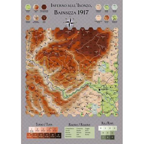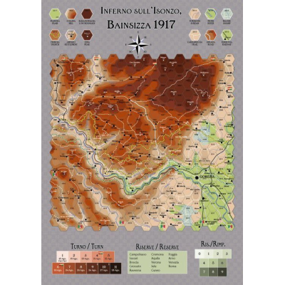 Inferno sull'Isonzo, Bainsizza 1917 es un juego de guerra de mesa de nivel operativo para dos jugadores sobre la 11ª Batalla del Isonzo, librada del 18 al 28 de agosto de 1917 en el frente italiano de la Primera Guerra Mundial. Después de bombardeos masivos y feroces combates, el Segundo Ejército italiano (general Capello) hizo retroceder el Isonzo Armée (general Boroevic) y conquistó la meseta de Bainsizza (Banjšice). Los austrohúngaros sufrieron 115.000 bajas frente a las 158.000 italianas.