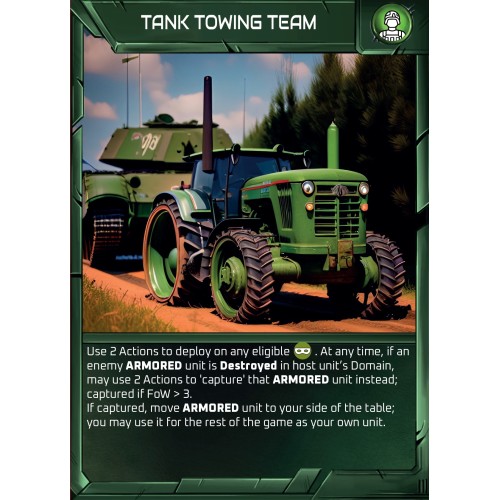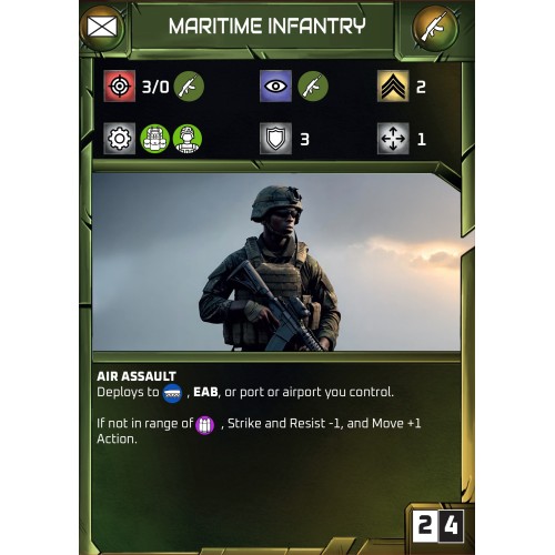 Los jugadores construyen mazos a partir de un arsenal de cartas que va desde guerrilleros hasta vehículos submarinos no tripulados y aviones de combate de nueva generación capaces de dominar las distintas áreas ('dominios' del juego) donde tendrá lugar el enfrentamiento. Puedes elegir una baraja con satélites de alta tecnología, hackers e influencers online, o puedes centrar tus esfuerzos en la acción directa con fuerzas aeromóviles, blindados y artillería masiva.