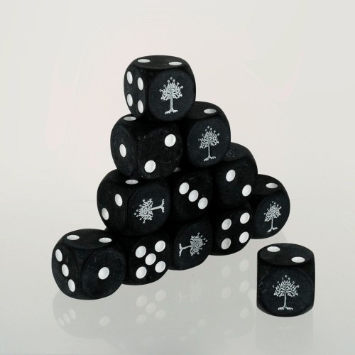 Set de 12 dados acrílicos negro mate con números en blanco y logo para jugar Gondor.